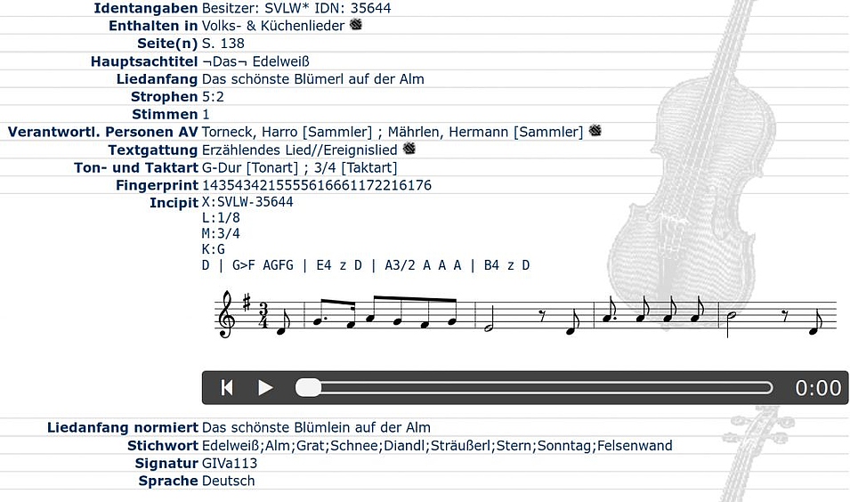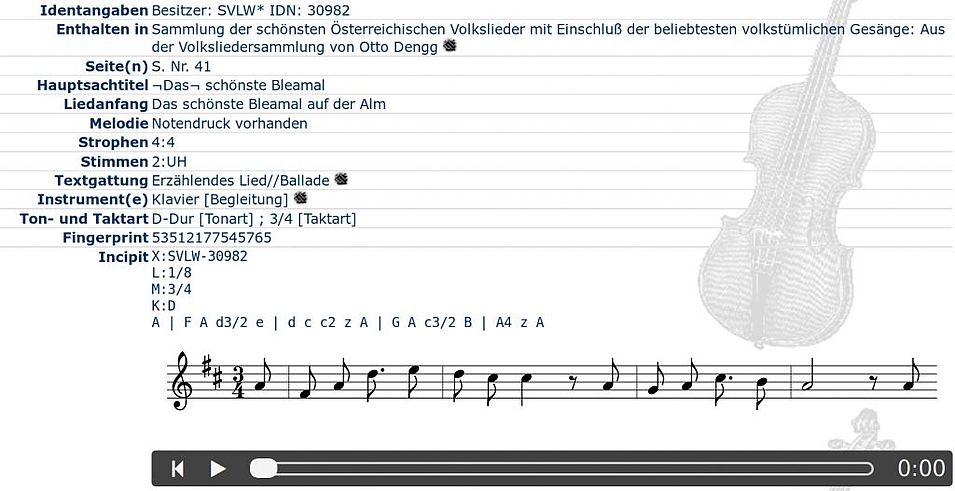 Anfang März 2019 schließlich konnte ein bedeutender Meilenstein in der Entwicklung unserer Datenbank gesetzt werden – es ist nun möglich, einem Lied oder Instrumentalstück Noten beizugeben, die dann von der Datenbank dargestellt und abgespielt werden können. Gerade im Volkslied- und Volksmusikbereich, in dem ein einziges Lied oft auf viele verschiedene Melodien gesungen wurde und wird, indem ein- und dieselbe Melodie oft unter verschiedenen Namen firmiert (z. B. Dorfheimer Walzer = Leoganger Landler), ist dies ein riesiger Gewinn für die Recherche – jemand, der sich auf die Suche nach einem bestimmten Lied an uns Volksliedwerke wendet, sieht nun auf einen Blick und hört auf einen Klick, ob es sich um die gewünschte Version handelt. Auch der Musikwissenschaftler, der zu einem einzelnen Lied verschiedene Belege sucht und diese miteinander vergleichen will, hat nun, von außen kommend, einen schnellen Überblick über die verschiedenen Varianten – das Nebeneinanderlegen und mühsame Vergleichen von zehn verschiedenen Druckwerken und fünf verschiedenen Handschriften mit den jeweiligen Versionen eines einzelnen Liedes entfällt damit.
