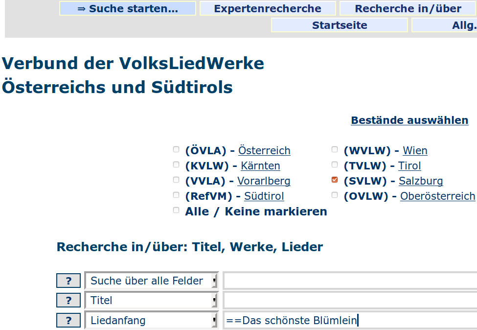 Die Suchanfrage „Liedanfang==Das schönste Blümlein“ (siehe Bild oben) liefert dann unter anderem die folgenden Suchergebnisse: