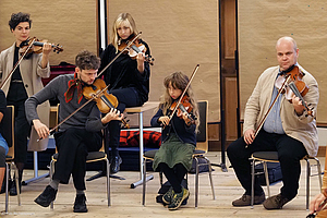 Während die Teilnehmenden der Geigen.Werkstatt am Freitagnachmittag ihre ersten Unterweisungen und Impulse erhielten, tagten die Archivleiter*innen der Österreichischen Volksliedwerke im Hofstall, um technische Neuerungen und aktualisierte Regelwerke für die Katalogisierung der musikalischen Volkskultur Österreichs ausführlich zu besprechen. Die ersten Interessierten, Tagungsgäste und potentiellen Konzertbesucher trieb es schließlich in den Schlosshof an den Empfangstisch des Salzburger Volksliedwerkes – kurze Zeit später spielten die Tanzgeiger im Kemenatensaal virtuos auf und boten einen ebenso ganzvollen wie furiosen Auftakt für die Rudi Pietsch Trilogie Der Himmel voller Geigen auf Schloss Goldegg.